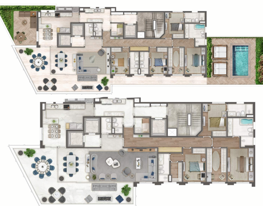 Cada apartamento ocupa um andar inteiro, tornando cada unidade uma casa suspensa entre o parque Ibirapuera e o eixo Faria Lima | JK.